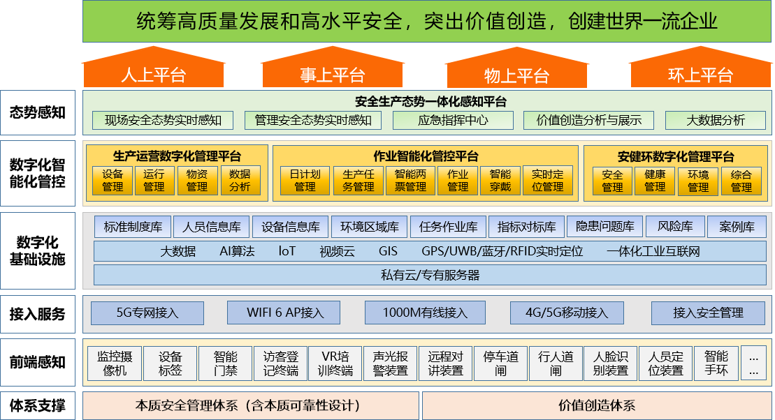 安全生产智能管控平台融合了人工智能、大数据、物联网等前沿技术,旨在实现企业安全生产和价值创造的全面智能化管理。平台架构包括以下六大模块: